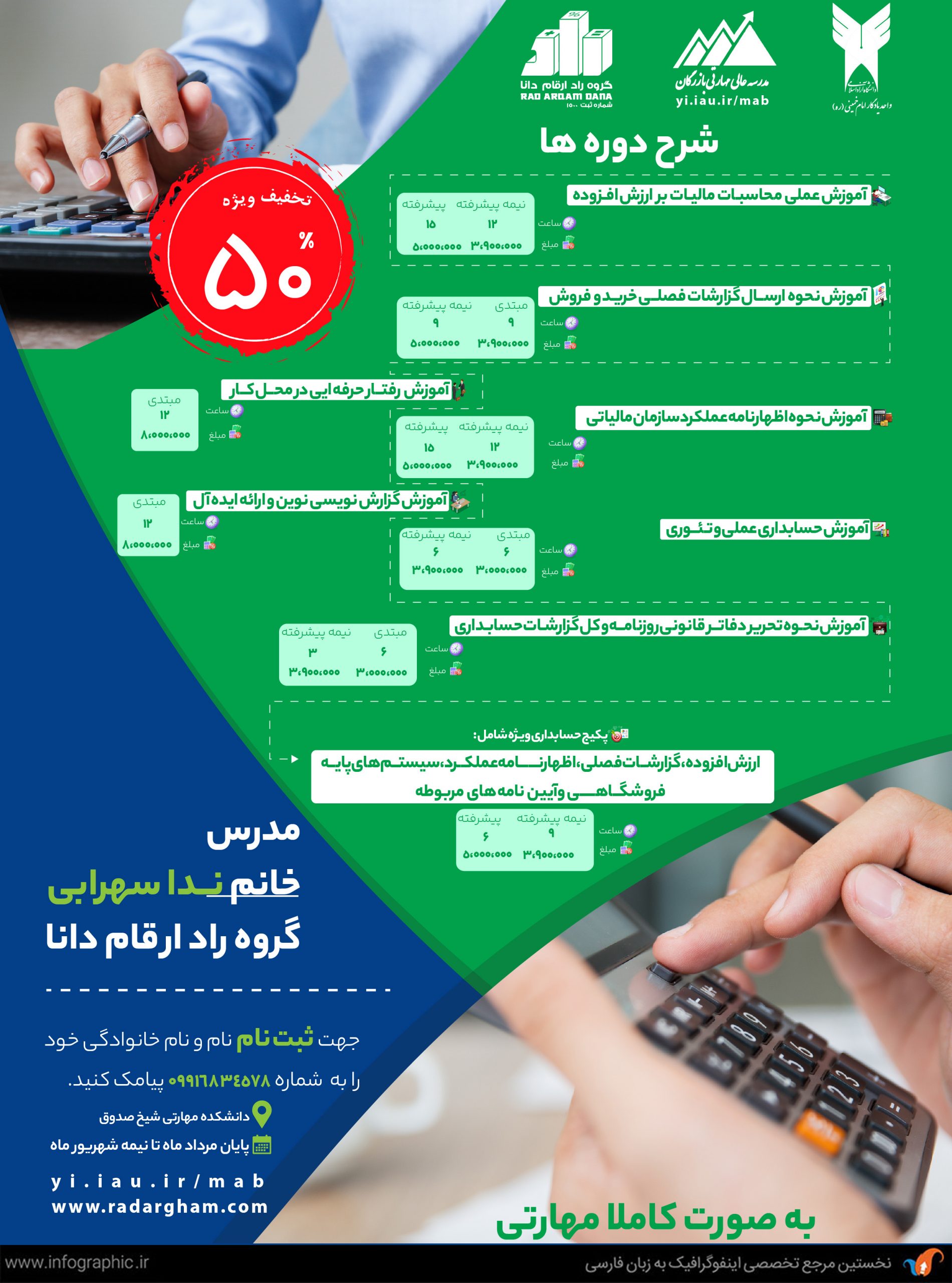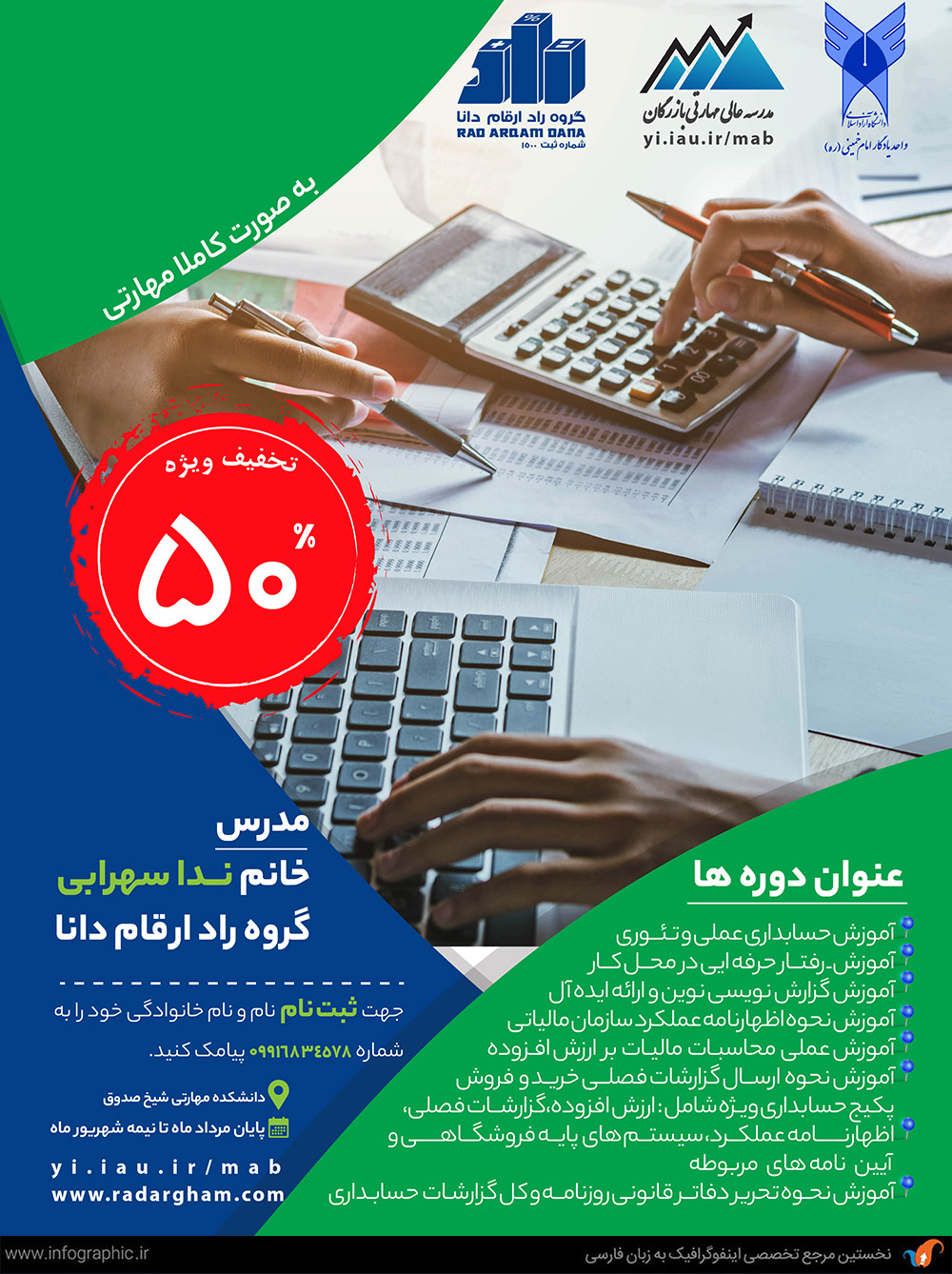 شرکت حسابرسی راد ارقام دانا با تشکیل کارگروه هاو کمیته های تخصصی در بین مدیران و پرسنل و ارتباط با مدیران صنعتی و اساتید مجرب دانشگاهی و صاحب نظران حرفه ای، سعی در ارتقای حرفه حسابداری و حسابرسی و اعتلای نام این حرفه در سطح داخلی موسسه و جامعه دارد. لازم به ذکر است هریک از مدیران موسسه در یکی از این کارگروه ها و کمیته های عضویت دارند. پوستر دوره های گروه راد ارقام توسط تیم طراحی ما، طراحی شد که در زیر مشاهده می فرمایید: